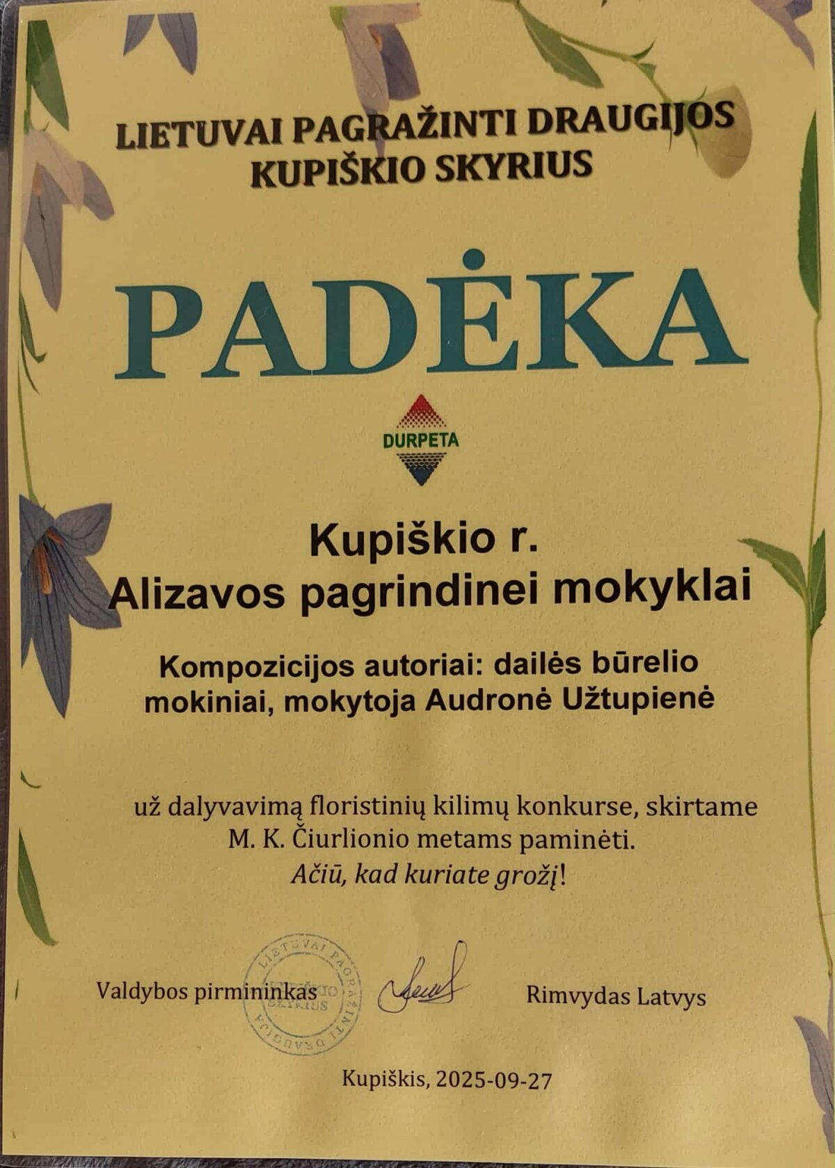 Alizavos pagrindinės mokyklos mokinių grupė dalyvavo floristinių kilimų konkurse, skirtame M. K. Čiurlionio metams paminėti. Konkursą organizavo Lietuvai pagražinti draugijos Kupiškio skyrius.