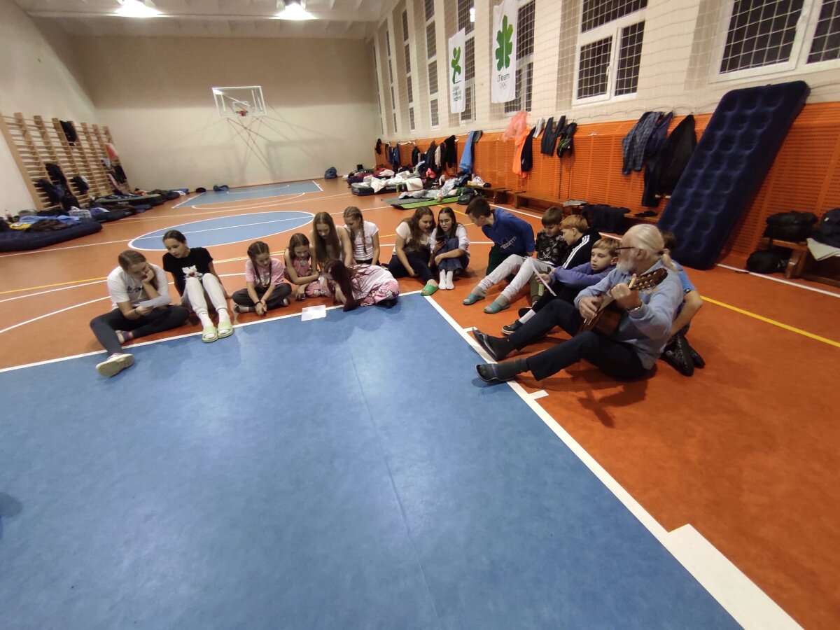 Vakare stovyklautojai apsistojo Povilo Matulionio Šimonių pradinio ugdymo skyriaus sporto salėje. Po dienos iššūkių laukė linksmos komandų prisistatymo programos ir šiltas bendravimas.